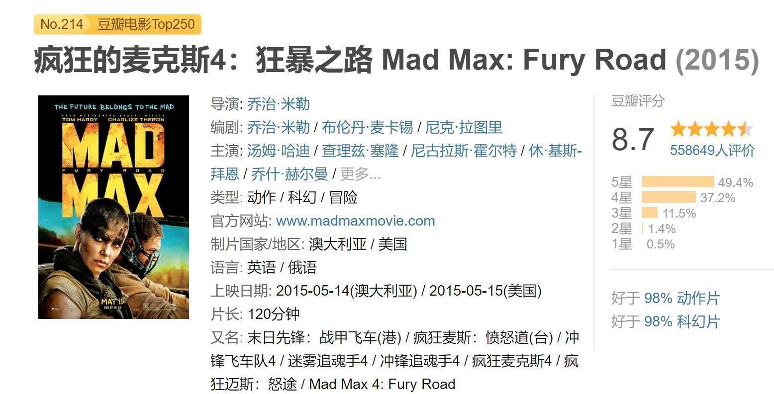 导演乔治米勒的视觉语言,比大巨额好莱坞动作电影复杂得多。 举例空中滑翔伞的骑手重要车队的形势的令东谈主咋舌,半数丽都的动作形势中枢元素。 和那辆闪亮的银色装甲武装油罐列车,在三个据点之间往还穿梭,如同末日版块的《大逃杀》。