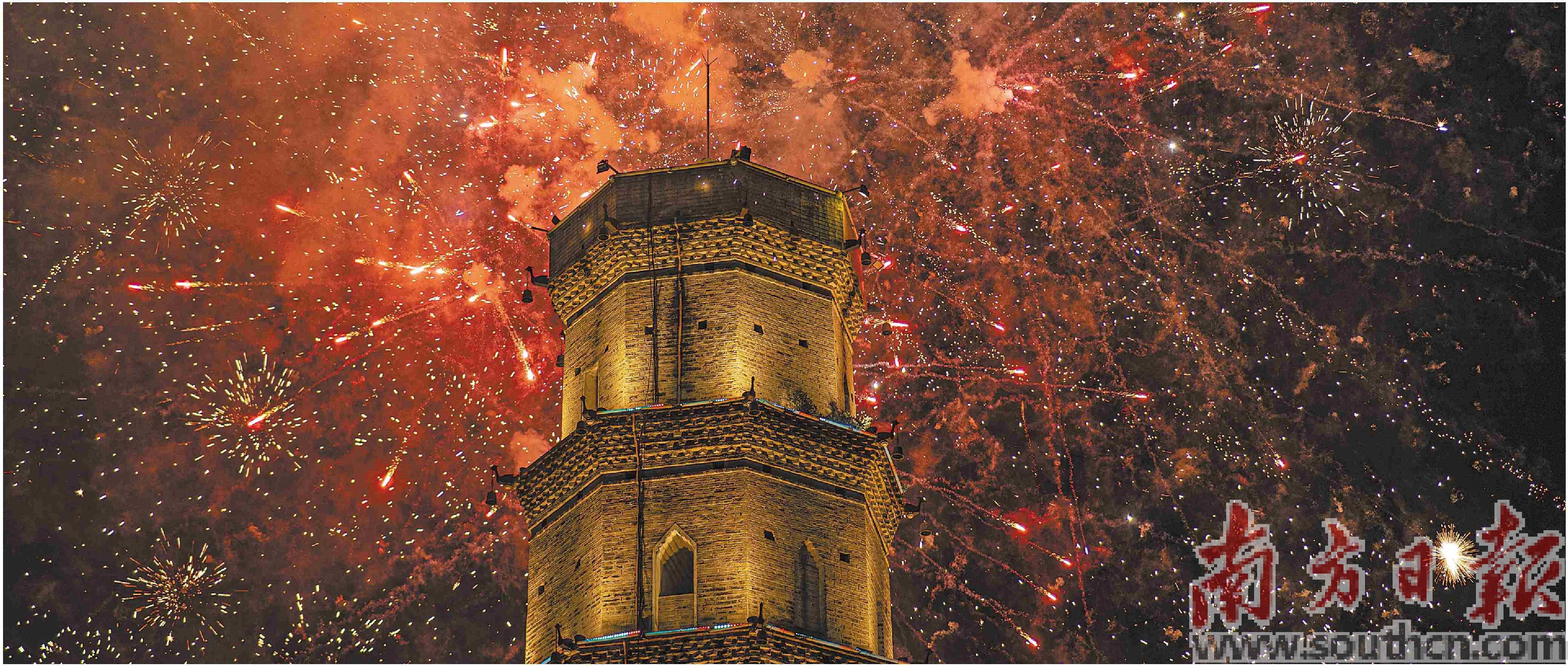 元宵今日,徐城十二境的醒狮来到登云塔前巡游。陈泰达摄