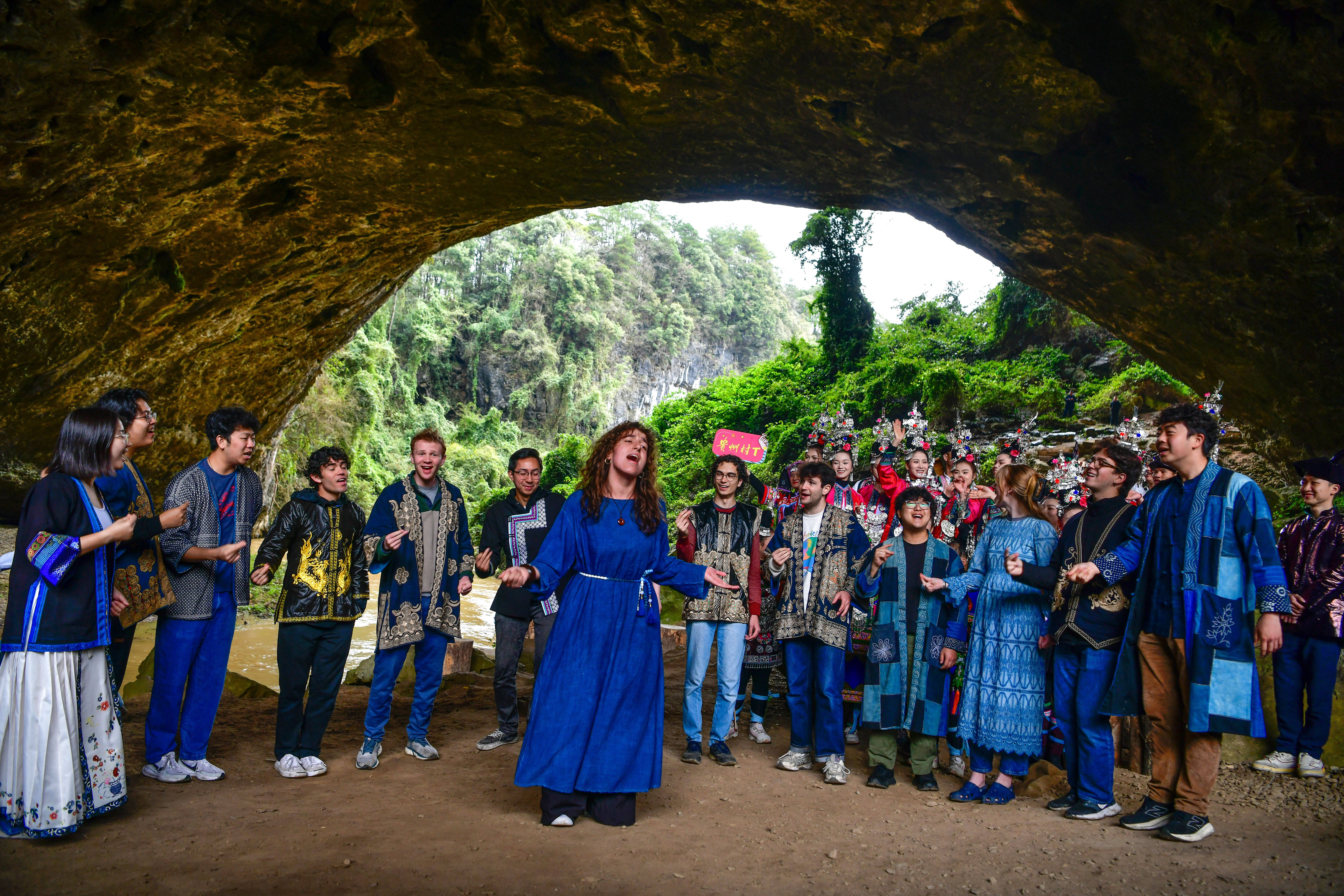 3月24日,在贵州省黎平县天生桥景区,好意思国耶鲁大学威芬普夫斯阿卡贝拉齐唱团在演唱歌曲。