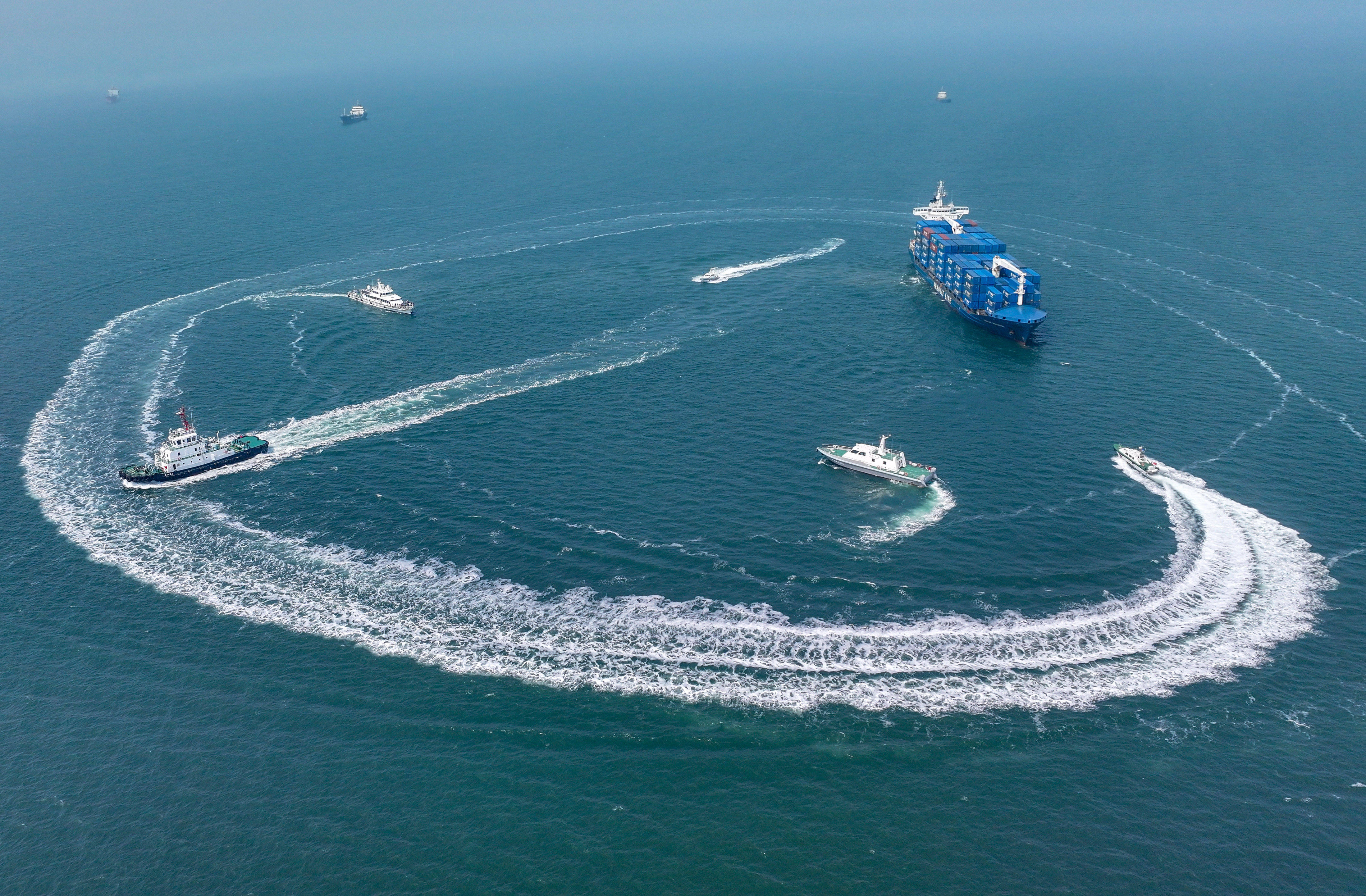3月25日,司法船只进行海上救急处突演练(无东说念主机像片)。3月25日,山东进出境边防查抄总站黄岛边检站调理海关、海事、港航公安等涉海部门,在山东青岛海域开展“国门利剑2026”调理司法四肢。
