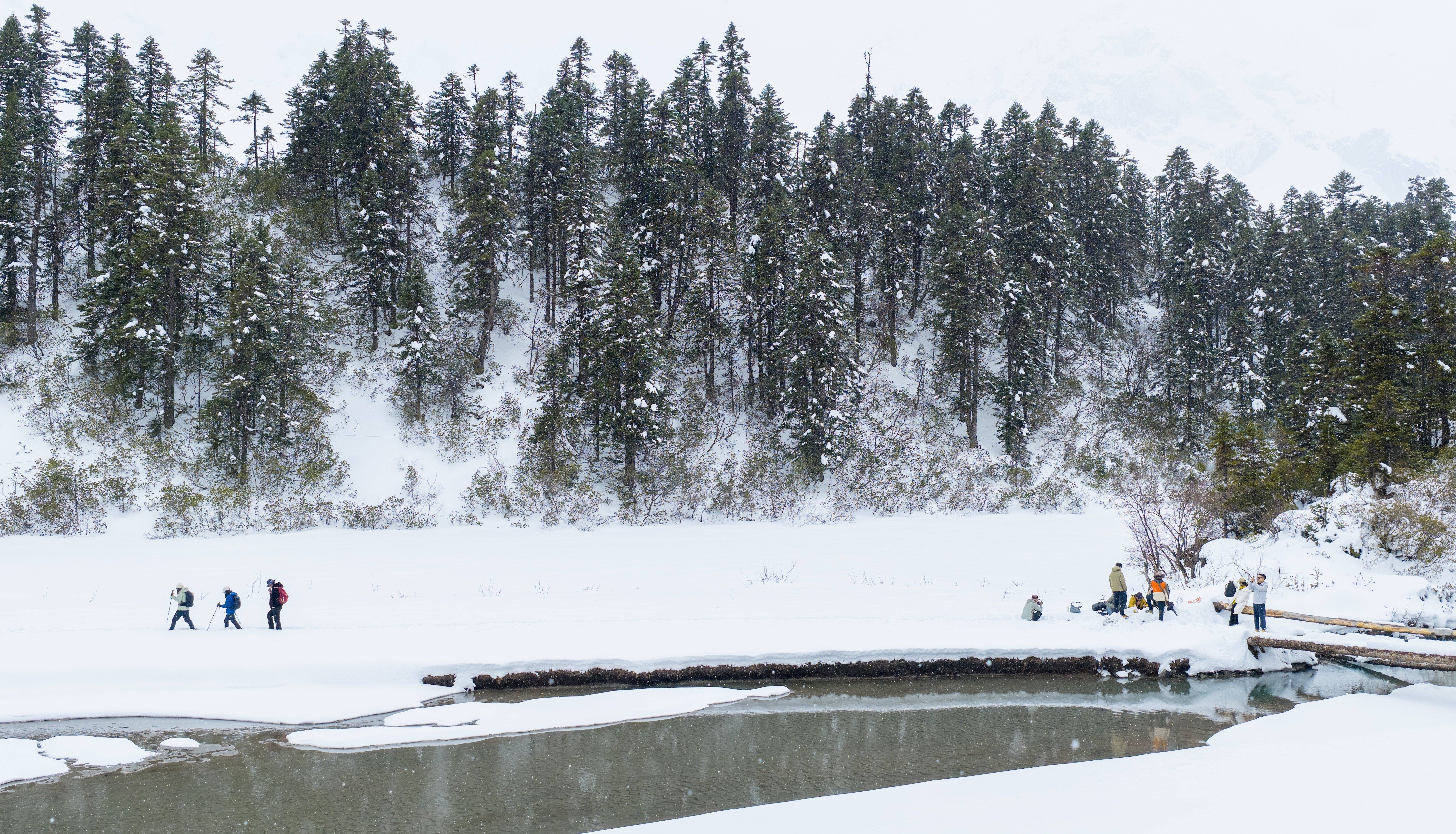 游东说念主在西藏自治区林芝市波密县的白普隆沟牧场感受雪景(3月21日摄,无东说念主机像片)。