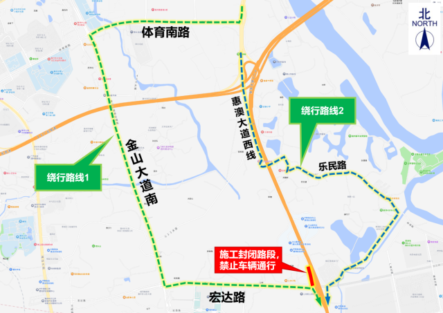 交通握住时刻,惠澳大路西线与宏达路交叉口北侧路段顽固,辞谢车辆通行。(如图1所示)