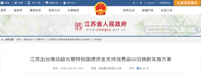 9月4日,据江苏省东谈主民政府网,为落实党中央、国务院决策部署,阐明《鼓励大鸿沟迷惑更新和蹧跶品以旧换新步履决策》和《加力相沿大鸿沟迷惑更新和蹧跶品以旧换新的多少措施》,鼓励超遥远卓绝国债资金相沿江苏省蹧跶品以旧换新,加快智能化、绿色化、健康化的高质料耐用蹧跶品参加住户活命,更好高傲东谈主民寰球好意思好活命需要,灵验普及国民经济轮回质料和水平,8月31日,省发展转变委、财政厅逢迎印发《江苏省鼓励超遥远卓绝国债资金相沿蹧跶品以旧换新的实行决策》(以下简称《实行决策》)。