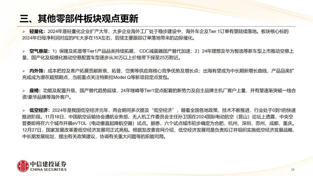 零部件:现时个股走势分化,自动驾驶、机器东说念主及低空经济板块包涵度较高,提议建立低估值绩优白马零部件标的和有新增长弧线的零部件标的。12月27日,佑驾革命(2431.HK)在港交所主板班师挂牌上市,亦然继速腾聚创、黑芝麻智能、地平线后国内又一家班师登录港股的智驾企业。12月26日,广汽集团认真发布第三代具身智能东说念主形机器东说念主——GoMate,成为国内第二家发布自研东说念主形机器东说念主的车企。日前国度发改委低空司已认真亮相,低空经济的产业趋势则类似2021年的机器东说念主,行业景气度不时朝上。后续络续包涵科技成长标的。