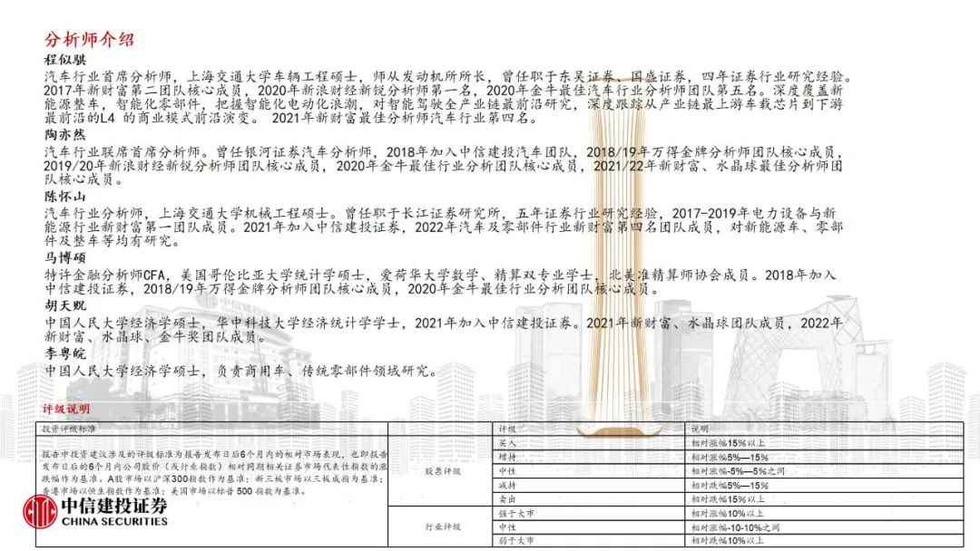 陈怀山:汽车行业分析师,上海交通大学机械工程硕士。曾任职于长江证券议论所,五年证券行业议论教化,2017-2019年电力莳植与新动力行业新资产第一团队成员。2021年加入中信建投证券,2022年汽车及零部件行业新资产第四名团队成员,对新动力车、零部件及整车等均有议论。