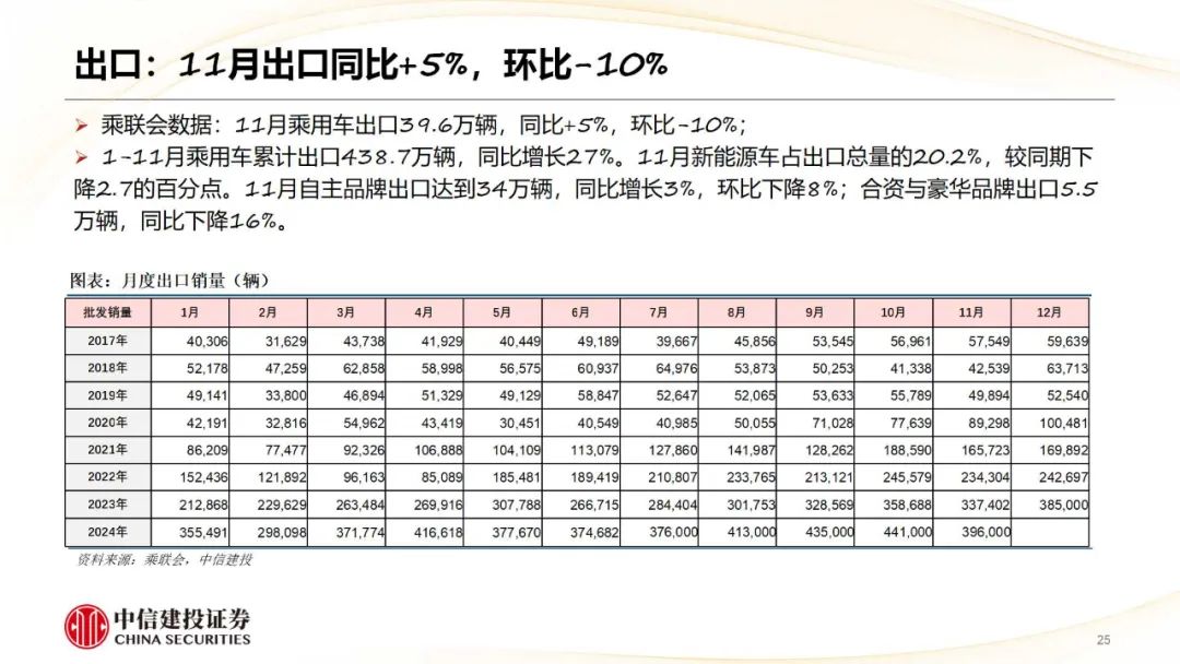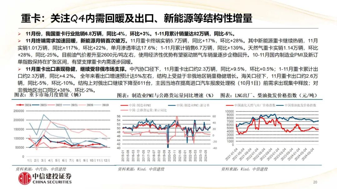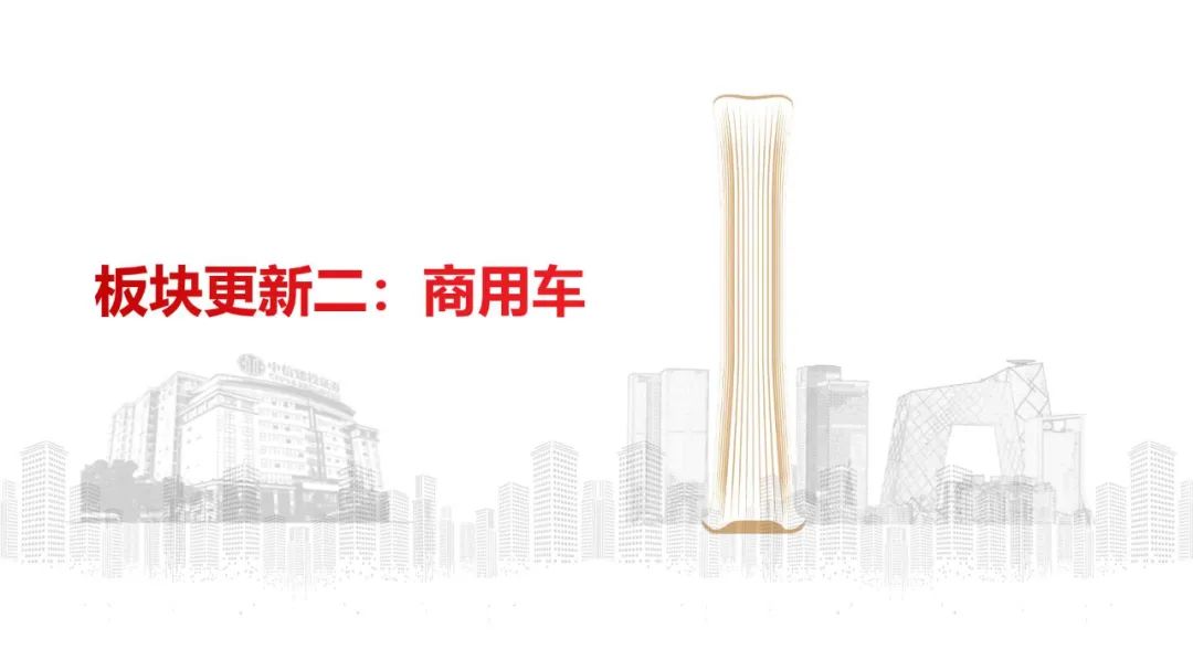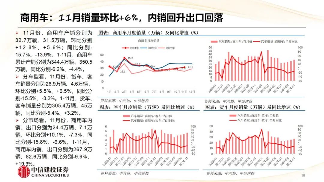 商用车:11月份,商用车产销鉴识为32.7万辆、31.5万辆,环比鉴识+12.8%、+5.6%;同比鉴识-15.7%、-13.9%;货车、客车销量鉴识为26.9万辆、4.6万辆,环比鉴识+5.5%、+6.5%,同比鉴识-15.5%、-3.2%。重卡包涵Q4内需回暖及出口、新动力等结构性增量,其中新动力月销初度破万;客车Q4补贴计谋带动公交热销,内需接棒出口扶助销量,大中客内销回暖显著。