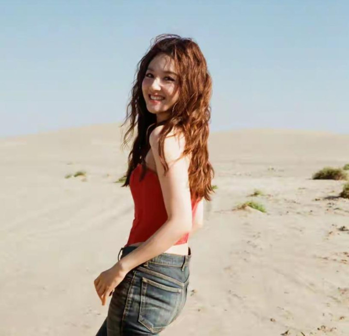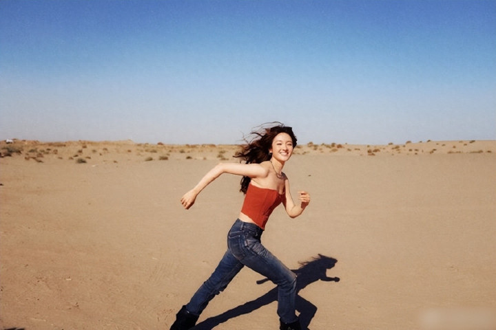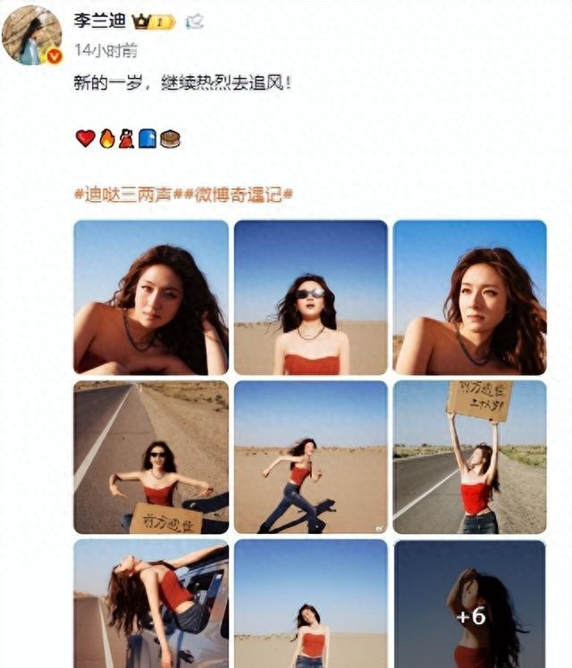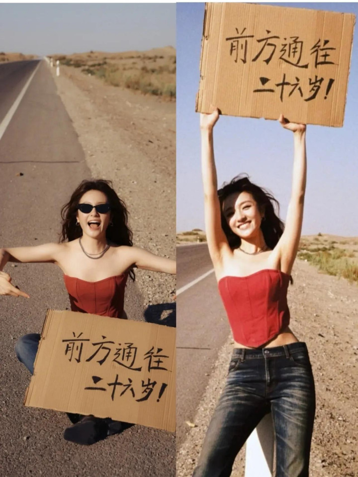 红色抹胸上衣+牛仔裤+羊毛鬈发 手合手“前线通往二十六岁”手写纸板,呈现“废土野性风” 烈日、风沙、原野衬托“公路文大女主”氛围被赞“沙漠中大肆滋长的红玫瑰”,“热辣超好意思”。