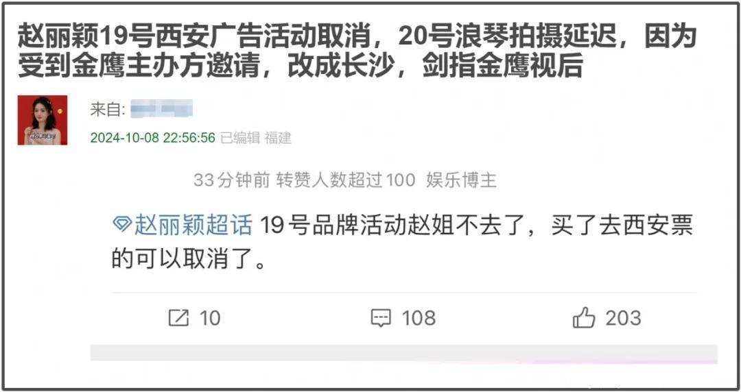 然则,有网友于近日爆料称“赵丽颖19号西安告白活动取消,20号拍摄延长,因为受到金鹰主理方邀请,改成长沙,剑指金虎睨后”,何况附上了赵丽颖粉丝奉告活动取消,让大家退票的截图。此外,爆料的网友还提到“本来行程都定了,径直取消去金鹰,收到了无垠邀请”。