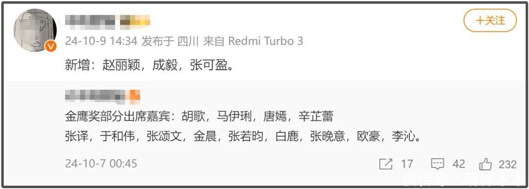 随后,有一直在跟进金鹰奖授奖庆典出席嘉宾名单的博主也更新了名单,新增三位明星,别离是赵丽颖、成毅和张可盈。蓝本不谋略出席的授奖庆典,倏得取消原定行程出席,这让大家不禁念念到一个可能,那即是赵丽颖极能够率二封金虎睨后。金鹰奖有一个沿袭成习的章程,不出席就不行能获奖。如今,赵丽颖的出席,让东说念主以为她二封金虎睨后很有戏啊。