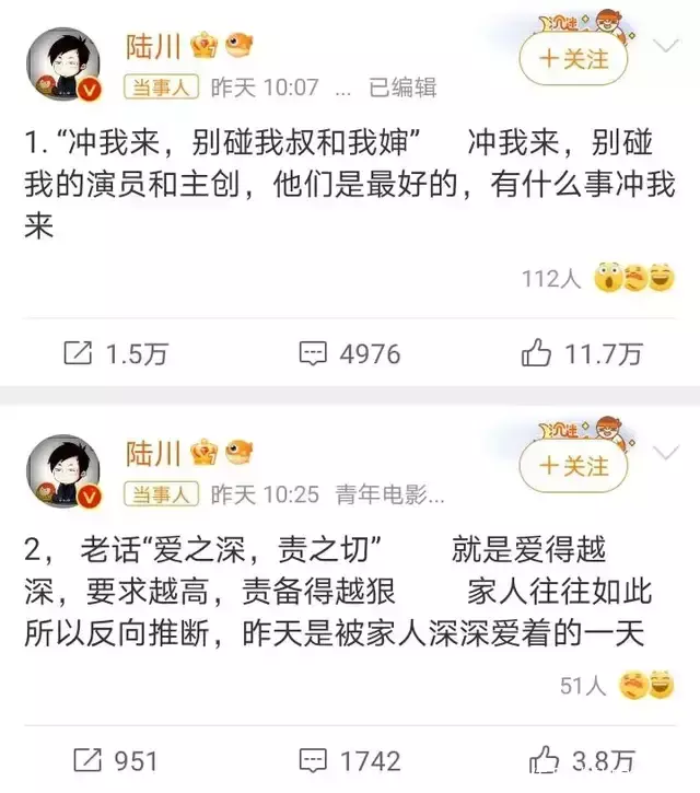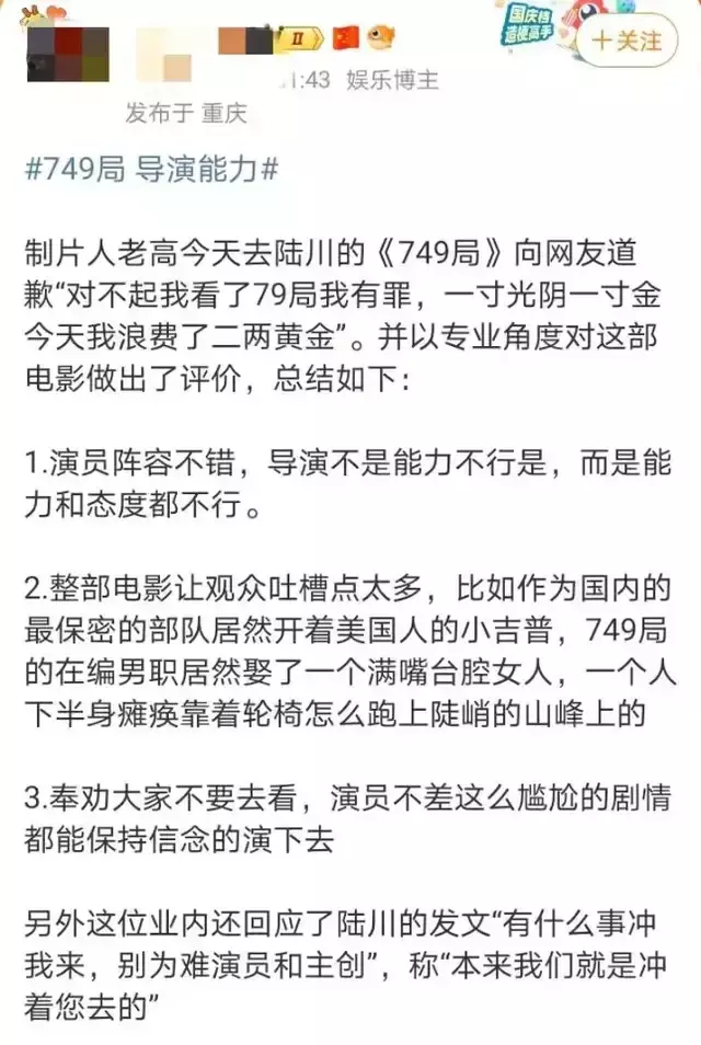 固然影迷们说《749局》超烂,但导演陆川并莫得将王俊凯推出来承受影迷肝火,而是在酬酢平台硬气发文。试问在职责里有谁会不可爱能扛事的雇主呢?