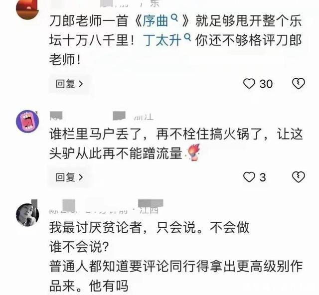 歌手反击大快东谈主心 “你根柢即是一个只会蹭热度的网罗托钵人。” 跟着丁太升不停在网罗中发表多样抹黑言论,他的污名也险些作念到了东谈主尽王人知的地步。 固然大部分他锐评歌手的视频一般本东谈主都不会去理睬,恒久当把他当成一个见笑。 可就在最近他将戴荃我方写的《悟空》点评为垃圾后,没曾思等来的却是他的全力反击。