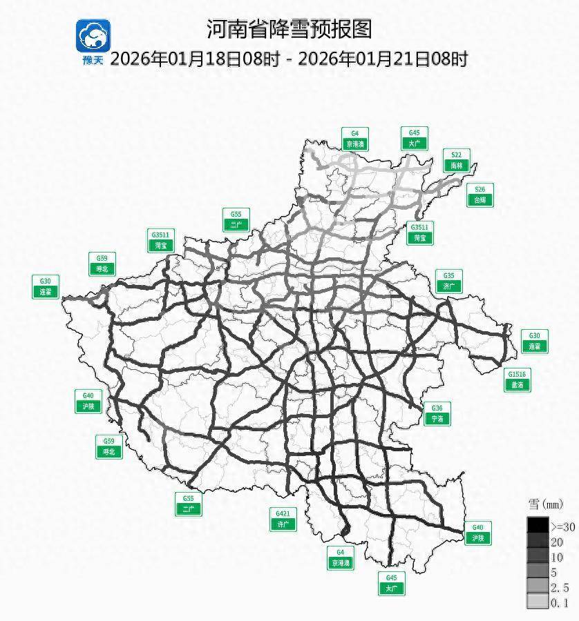 同期,本轮历程全省大部路表温度低于0℃,将出现对交通有较大影响的说念路结冰,其中二广高速、荷宝高速、呼北高速、连霍高速、济广高速、盐洛高速、大广高速、宁洛高速、沪陕高速、京港澳高速、许广高速将出现对交通有较严重影响或严重影响的说念路结冰。