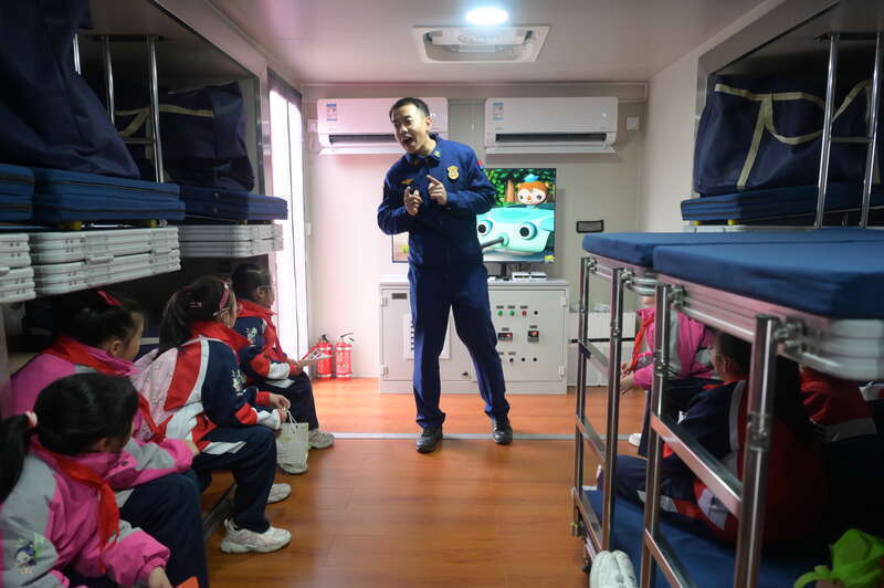 1月31日,福建南平,延平消防救援无邪中队,消防员携带学生集体参不雅消防宿营车。杨鸿磊/摄