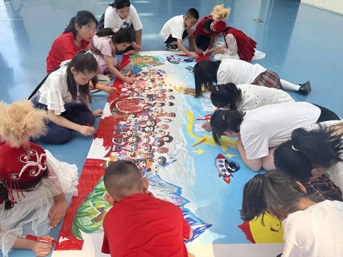 由中国民族博物馆发起的“童心共筑中国梦·儿童绘制作品展览及疏导神气”,旨在以艺术为纽带铸牢中华英才共同体强项,促进各族青少年泛泛来往、全面疏导、深度和会。图为2023年8月,来京疏导的儿童共同创作“童心共筑中国梦”大型作品。受访者供图
