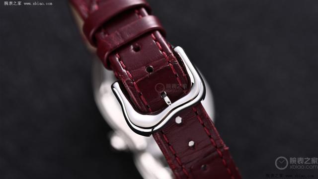 手表表冠处嵌入有一颗凸圆形红坚持,这是卡地亚铂金表款的记号性细节。红坚持配上铂金的欺诈让这款手表显得愈加尊贵和优雅。再搭配上半哑光勃艮第色鳄鱼皮表带,辽远的酒红色与又铂金的银色形成显著对比,营造出一种相沿而丽都的视觉张力。